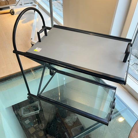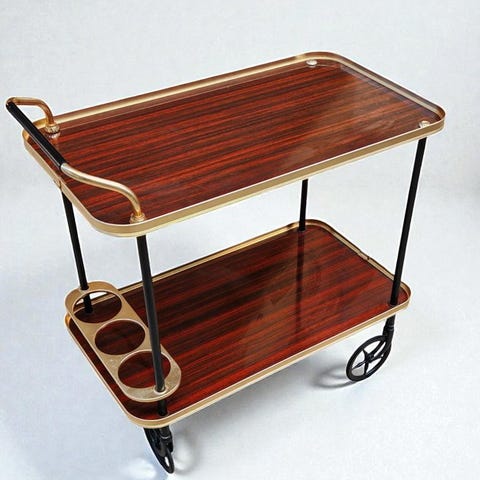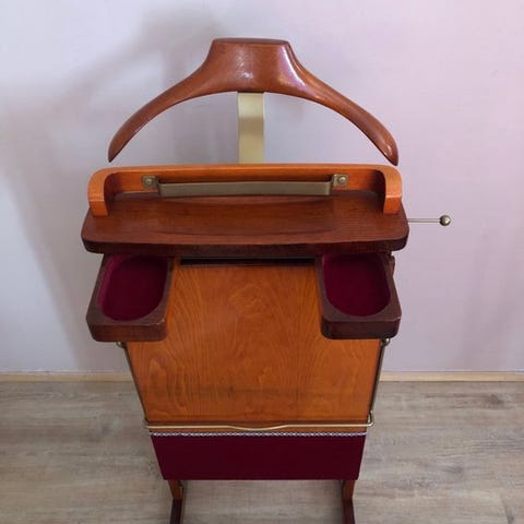 Et stort klassisk midcentury-objekt fra Italien. Servomøbel af brødrene Reguitti fra 70'erne. Dette meget smukke og velbevarede eksemplar har en mørk egfarve med originale messinghjul. Det har et urskab og sideholdere til slips og bælte. Det vil blive godt emballeret, og forsendelsen vil være sporbart.