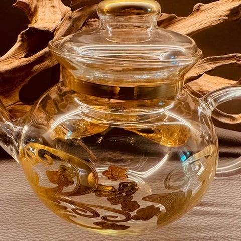 Sættet indeholder en smukt udformet tekande dekoreret med et stiliseret grafisk mønster, der kombinerer geometriske kanter og dekorative fuglemotiver.
