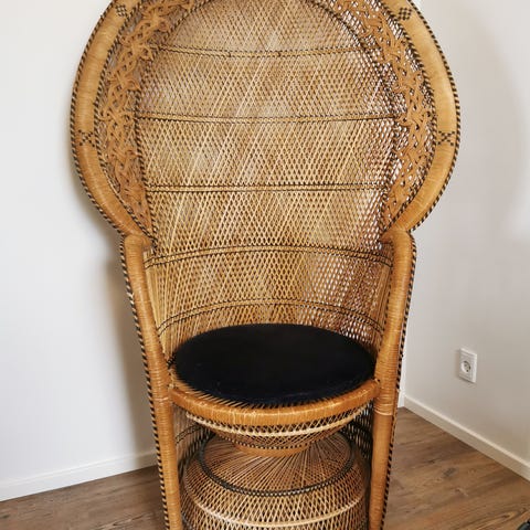 Peacock-stol af rattan, vintage stil fra 1960–1970, oprindelse Belgien, højde 136 cm, bredde 57 cm, dybde 47 cm, god stand med mindre slid, rød pude inkluderet, afhentning i Lier, Belgien. Klik på den blå "gå til varen" knap, for at købe eller byde på denne vare. Den samlede pris vil blive vist inden du afgiver dit bud.