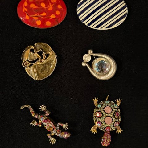 Sjælden samling af 8 vintage brocher – rhinestones, emalje og guldfarvet meta...