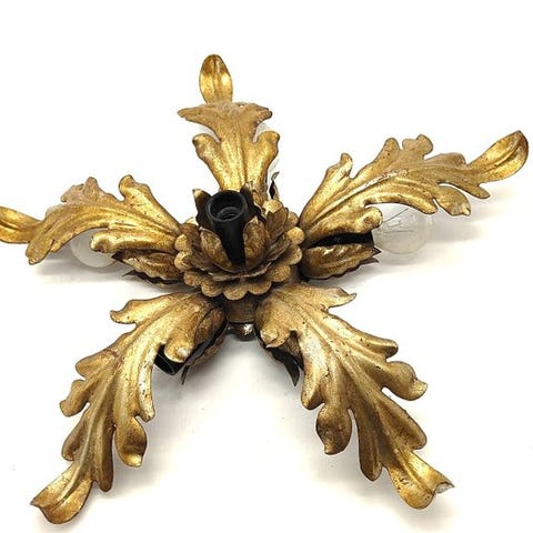 Krempatineret italiensk tole-kronlampe af Bloemen & Bladeren Tôle Chandelier, cirka 1960–1980, med adskillige håndlavede farverige blomster- og bladdetaljer, fem fatninger, af metal og porcelæn, bredde 58 cm, dybde 58 cm, højde 68 cm, i god stand med mindre alderstegn, ledning og låse i form af stearinlys inspiceret og i orden, klar til at blive hængt op. Klik på den blå "gå til varen" knap, for at købe eller byde på denne vare. Den samlede pris vil blive vist inden du afgiver dit bud.