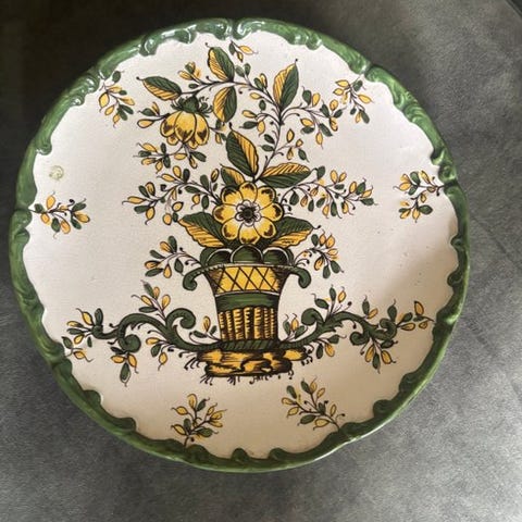 Håndmalet porcelæns centertallerken med gennemprikket forgyldt metalklem i rokoko/Louis XV-stil, farverig blomsterdekoration med 22 karat guldaccenter, på buede fødder; længde med håndtag 31,7 cm, tallerkenens diameter 27 cm, højde 6,7 cm; i god vintage stand med let aldersforandring og patina på metallet. Klik på den blå "gå til varen" knap, for at købe eller byde på denne vare. Den samlede pris vil blive vist inden du afgiver dit bud.
