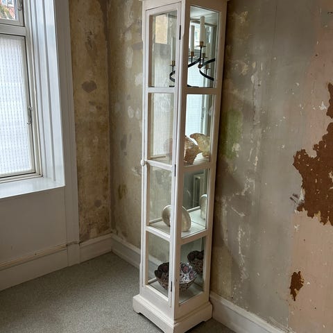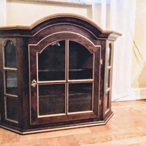 Wortelnoten væg/hængende barok vitrineskabe i ny stand. Højde 72 cm, bredde 68 cm, dybde 16 cm. Dette er de ydre mål. Dette vitrineskab bliver forsvarligt pakket og forsikret sendt. Afhentning kan eventuelt også ske i Teteringen ved Breda, Holland.