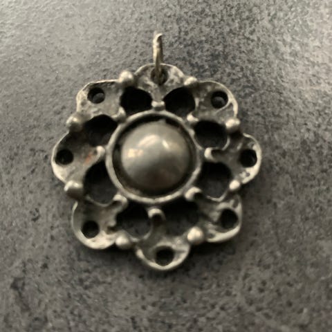 Vedhæng, tin, fint tin smykke i form af et vedhæng. kr. 30,-