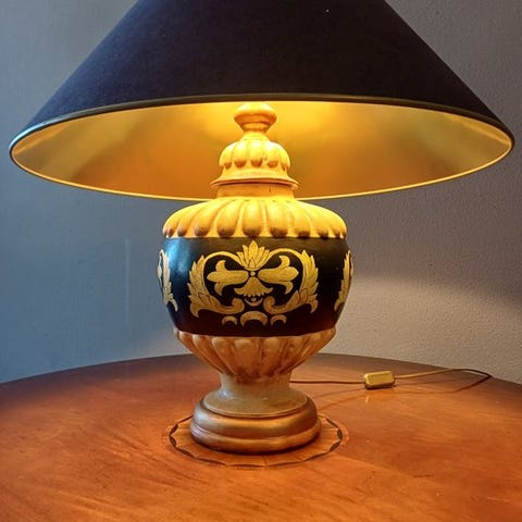 Lampen har en lampskærm i okkergult velour med en guldfarvet indvendig side.