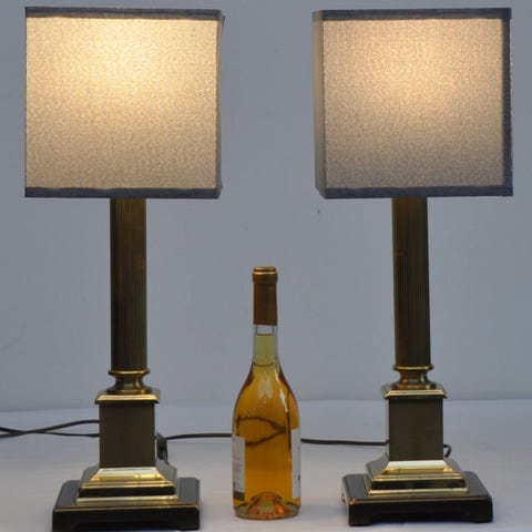 Messinglampe med malet koblet shade i Regency-stil fra Herda (Nederlandene), 44 cm høj, skærmdiameter 20 cm, foddiameter 12 cm, E27 fatning, kabling fornyet med gyldent kabel og af/på-knap, egnet til LED eller glødelampe, i god brugt stand med mindre aldersspor og i funktion, mærket på fatningen. Klik på den blå "gå til varen" knap, for at købe eller byde på denne vare. Den samlede pris vil blive vist inden du afgiver dit bud.