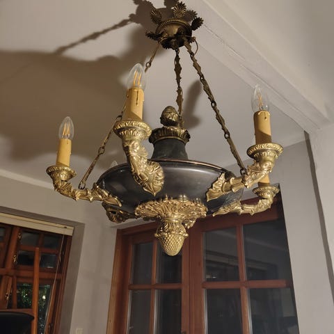 Lysekrone i Empire-stil i gildet bronze og grøn patina, sandsynligvis fra det 19. århundrede.