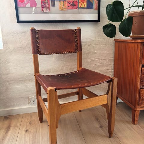 To rockabilly cocktailstole i kraftig orange, polstret med kunstlæder, med omgivende hvid piping og dekorative knapper bagpå ryglænet. Sæt‑omfang: 2 stole som et par. Koniske træben og små træarmlæn, sæde med fjederfyldning (som angivet). Moderne 50’er-/60’er‑look, perfekt til stuen, barhjørnet eller studie. Stand: Meget velholdt, brugt med lette folder og mærker, ingen af de skader, du nævnte.
