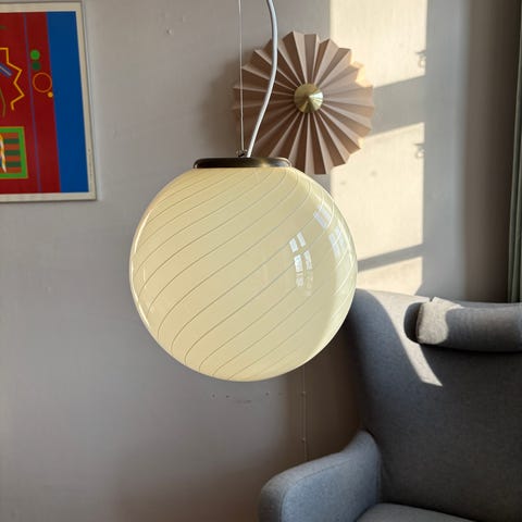 Flot cremefarvet Murano lampe med hvidt swirl-mønster. 20 cm. Kan bruges som både pendel (som vist) eller bordlampe. Vintage og med let patineret messing-ophæng/fod.