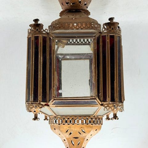 Antik fransk loftlampe fra 1970’erne med hexagonalt messingstel og originale syreætsede krystalprisme, 4 E14-pærer, højde 50 cm, bredde 37 cm, dybde 37 cm, vægt 4 kg, i god brugt stand og elektrisk testet og i funktion. Klik på den blå "gå til varen" knap, for at købe eller byde på denne vare. Den samlede pris vil blive vist inden du afgiver dit bud.