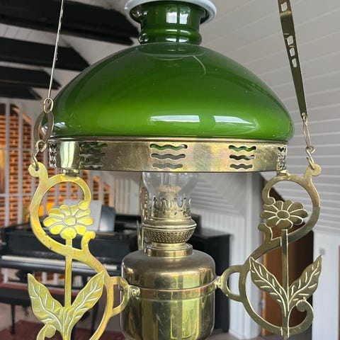 Smuk glas-in-lood-hængelampe i nytilstand. Lampen har et kunstnerisk design med grønne og beige nuancer, der spreder stemningsfuldt lys. Perfekt til et klassisk eller eklektisk interiør.