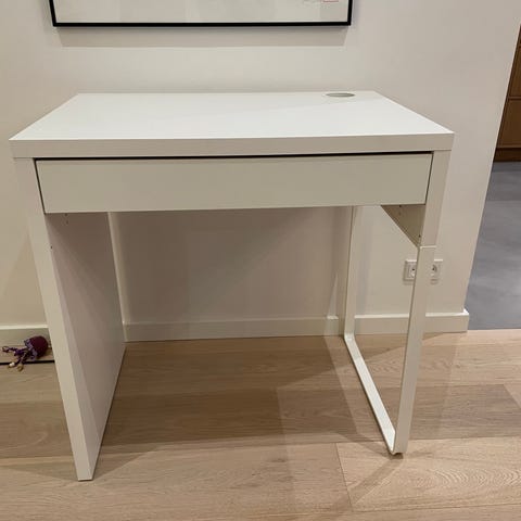 IKEA Micke skrivebord med tilhørende stol. Skrivebordet er hvidt med en skuffe og et skab. Stolen har rosa polstring og hjul for nem bevægelse.