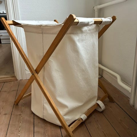 Vasketøjskurv i træ. Jeg tror den er fra jysk. Standen er fin bortset fra farveændring på låget, se billeder.