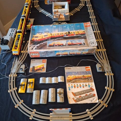 Lego 7740 Inter-City Passagertog, et 12V elektrisk tog sæt fra 1980, oprindelig fra Danmark, komplet med original æske med indlæg, klistermærkesæt og bygges instruktioner, inklusive perron og skinner samt tolv minifigurer, med fungerende motor og belysning, brugt og i beskadiget åben origænsk æske. Klik på den blå "gå til varen" knap, for at købe eller byde på denne vare. Den samlede pris vil blive vist inden du afgiver dit bud.