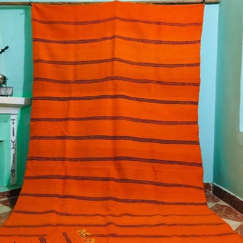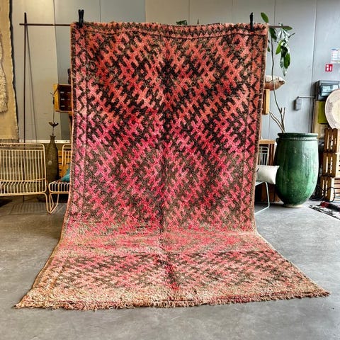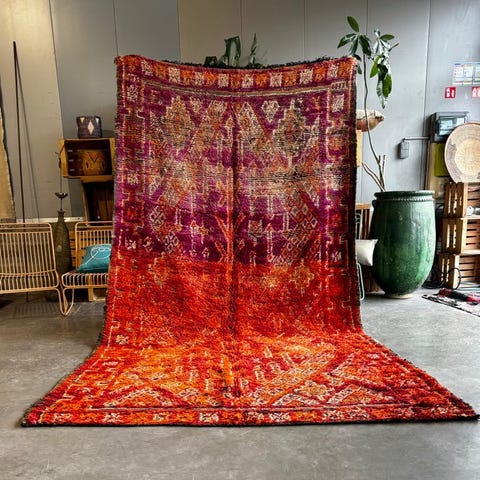 Dette tæppe er håndvævet med traditionelle berberteknikker og afspejler den originalitet og kunstneriske frihed, der er typisk for Talsint-håndværket. Designet kombinerer livlige farver med slående geometriske former, hvilket skaber en unik visuel balance, der gør tæppet til et kraftfuldt dekorativt udtryk.