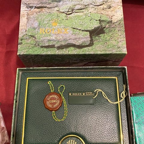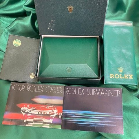 Færdiggør med: Rolex-sigil, Submariner-bog i 1992, på engelsk, Din Rolex Oyster grøn, fra 1991, også på engelsk.