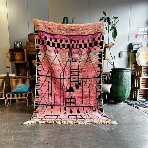 Med en fængslende blanding af dristige farver og indviklede geometriske mønstre er dette Boujad-tæppe et vidnesbyrd om de kunstneriske traditioner, der er blevet videreført gennem generationer. Dets unikke sammensætning og mønstre fortæller en historie om marokkansk kultur, hvilket gør det til et bemærkelsesværdigt tilskud til enhver boligindretning.