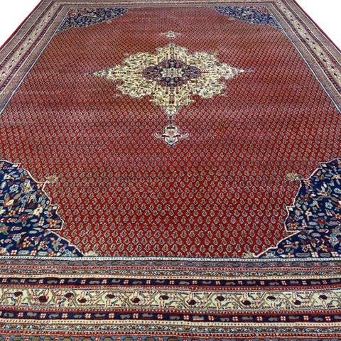 Oprindelse Indien, Model Mir- Gereinigd, håndtuvet tæppe af uld på bomuld, 350 cm x 250 cm, fremstillet i slutningen af det 20. århundrede, generelt i god stand med alders- og brugsmerker, professionelt rengjort, certifikat. Klik på den blå "gå til varen" knap, for at købe eller byde på denne vare. Den samlede pris vil blive vist inden du afgiver dit bud.