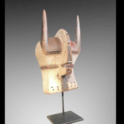 Træmaske af Kifwebe (Songye) fra Den Demokratiske Republikken Congo, dateret cirka 1940–1950, med kostume, dimensioner 50 cm høj og 24 cm bred, provenance: indsamlet i 1952 af Comboni-faderen Luigi De Giorgi i Kasongo, DR Congo. Klik på den blå "gå til varen" knap, for at købe eller byde på denne vare. Den samlede pris vil blive vist inden du afgiver dit bud.