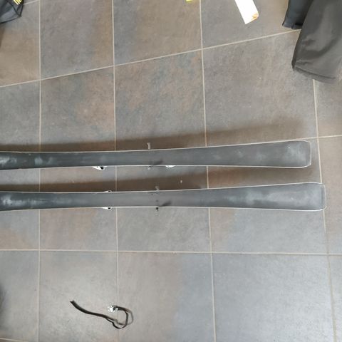 Som nye, bredde 8-11,5 cm. Skistave længde 124 cm og alpine styrthjelm grå og bordeaux str. 52-57 medfølger. Evt. Ældre hvide salomon skistøvler str. 38.