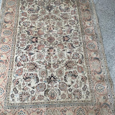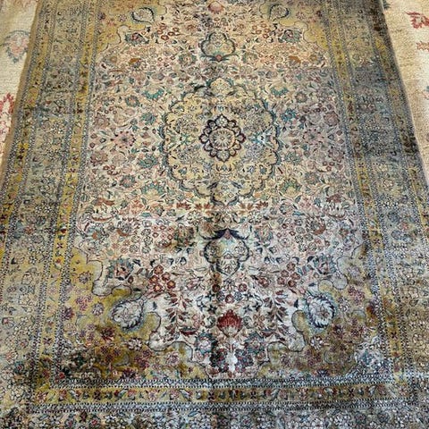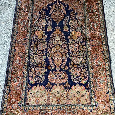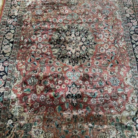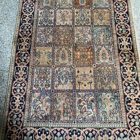 Oprindelse: Indien; Mål: 150 x 95 cm; Materiale: silke på bomuld; Produktionsperiode: midten af det 20. århundrede; Tilstand: i rigtig god stand; Professionelt renset. Klik på den blå "gå til varen" knap, for at købe eller byde på denne vare. Den samlede pris vil blive vist inden du afgiver dit bud.