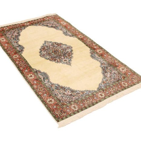 Fantastisk 24/24 kvalitet med ~1 mio. knuder/m². Nyt håndlavet indisk Kashmir-silketæppe med et smukt flisedesign med lyse farver og klassisk design. Lavet med en ren silkeluv og en ultraluksuriøs 24/24 kvalitet på et bomuldsunderlag. Dette tæppe er alt, hvad de indiske Kashmir-silketæpper af højeste kvalitet er berømte for, og det er en af de mest værdifulde og fineste typer silketæpper.