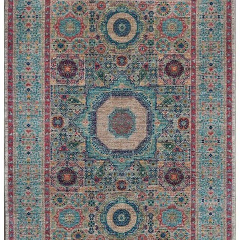 Et udsøgt håndknyttet designer tæppe med avanceret Mamlouk-design, der imponerer med sine fine geometriske mønstre og harmoniske farver. Det centrale medaillon, omgivet af kunstfærdigt arrangerede ornamenter, giver tæppet en imponerende dybde og elegance.