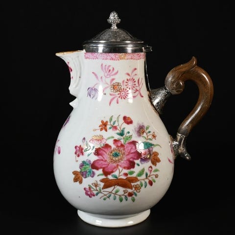 Porcelæns sukkerkande med dragehoved-håndtag, dekoreret i Famille Rose emaljer med mandariner, Qianlong-perioden (1736–1795), højde 12,8 cm og bredde 15,5 cm inkl. håndtag, i god brugt stand med små aldersmærker og en lille rippe på lågets kant. Klik på den blå "gå til varen" knap, for at købe eller byde på denne vare. Den samlede pris vil blive vist inden du afgiver dit bud.