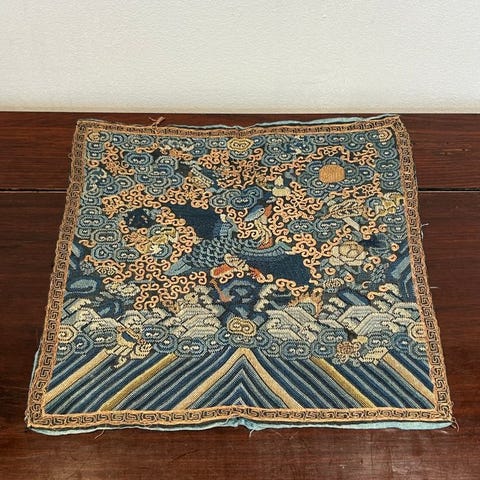 En meget fin silke Kesi-embroidery dekoreret med guldbroderi og rangordensmærker. Meget udtryksfuldt broderi, smukt inddelt og forsynet med guldbroderi. Dekoreret med en kranvogel og skatte. På bagsiden er der blå silke stof.