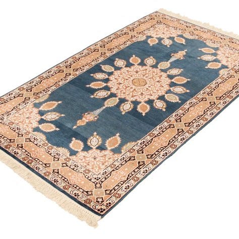 Et håndvævet Kashmir-silke over bomuld tæppe fra Indien, model Kashmir Seide sehr Fein, ca. 186 × 120 cm, i meget god stand og professionelt renset. Klik på den blå "gå til varen" knap, for at købe eller byde på denne vare. Den samlede pris vil blive vist inden du afgiver dit bud.
