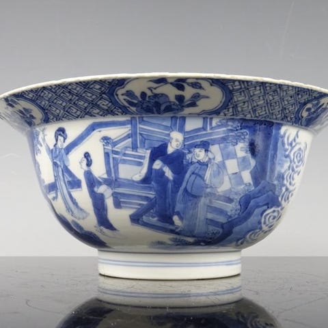 En smuk antik kinesisk porcelænskål af usædvanlig høj kvalitet og fin størrelse med en indvendig dekoration af en krage på en klippe i et landskab og ydre dekorationer af paneler med forskellige blomster, blomsterknopper og en fersken, udført i en enestående underglasblå og hvid. Disse skåle kaldes 'Kraaienkom'.