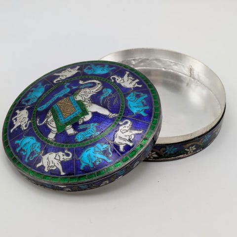 Disse udsøgte sølvsmykkede bokse, omhyggeligt fremstillet i Indien og erhvervet for omkring fyrre år siden fra en anerkendt antikvitetshandler i Saudi-Arabien, blev engang brugt i den ædle kunst at falkejagt til at opbevare mad til trænede falke. Hvert stykke udviser den raffinerede kunstfærdighed og dekorative mestring, der er karakteristisk for traditionelt indisk sølvsmedearbejde — fint jagede blomstermotiver, arabesque-ruller og repoussé-arbejde af bemærkelsesværdig kompleksitet.