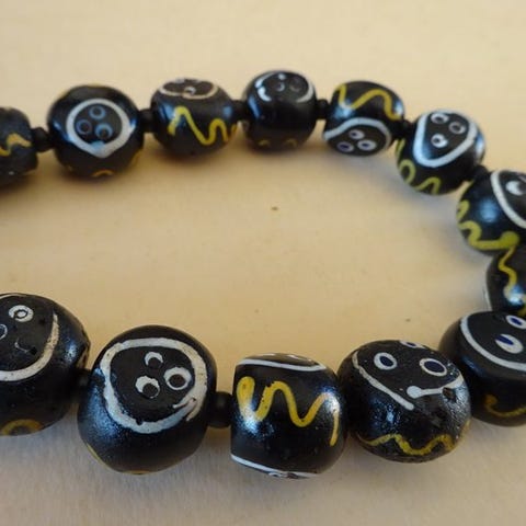 Strand af udvalgte usædvanlige og svære at finde gamle, sort-hvide agater. Bemærk den indviklede form på de fleste af perlerne. Kilde: Vestafrika.