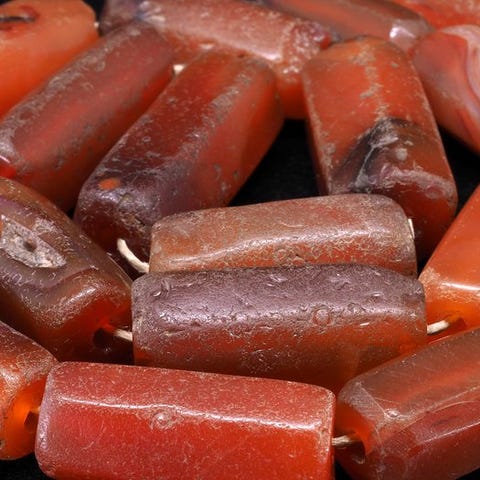 Perlekæde, gammel artefakt fra Indien – Mali, agat, længde 42 cm, perler 9,6 × 7 mm til 16,5 × 16,6 mm. Klik på den blå "gå til varen" knap, for at købe eller byde på denne vare. Den samlede pris vil blive vist inden du afgiver dit bud.