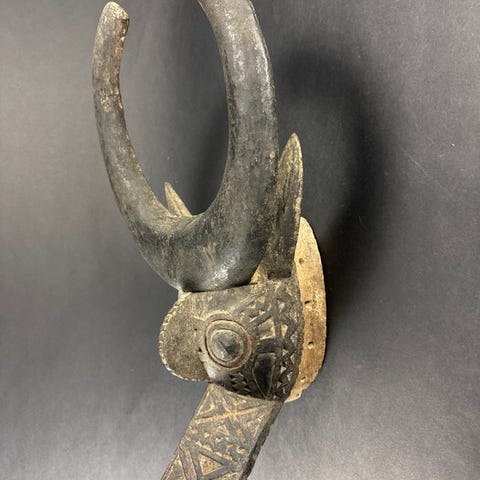 Maske i træ fra DR Congo af Ngbaka- oprindelse, dateret til midten af det 20. århundrede (ca. 1940’er–1950’er), i god stand, med sokkel inkluderet, måler 15 cm i højden, 11 cm i bredden og 5 cm i dybden, 400 g, provenance: fransk samling, autentisk. Klik på den blå "gå til varen" knap, for at købe eller byde på denne vare. Den samlede pris vil blive vist inden du afgiver dit bud.