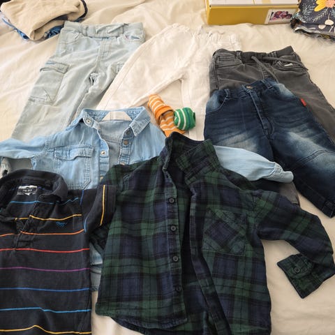 Består af 4 tynde langærmede bluser den ene med hætte og 3 tykkere sweatshirt. Lindex, Pompdelux, name it, H&M.
