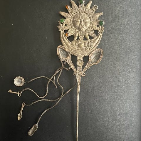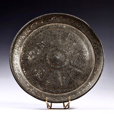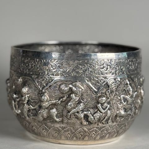To antikke sølvgenstande fra birmansk kolonitiden (sent 1800-tallets-slut og begyndelsen af det 20. århundrede): en kop og en birmisk spænde i sølv, begge hamrede og prægede, samlet vægt 307 g (kop 256 g, spænde 51 g), kop 9×18×10 cm og spænde 8,8×8×1,8 cm, sølvindhold testet til 800/1000 eller højere, i god stand med normalt brug og en let deformitet i bunden af koppen, så den ikke står helt lige; stand medfølger ikke. Klik på den blå "gå til varen" knap, for at købe eller byde på denne vare. Den samlede pris vil blive vist inden du afgiver dit bud.