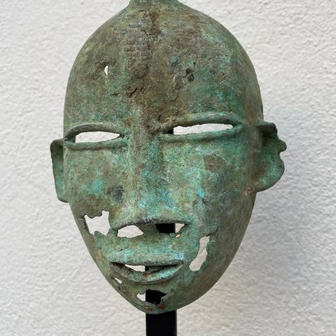 Bronzemaske Muria, en rituel antropomorf maske fra Muria-stammene i Bastar i Madhya Pradesh, Indien, dateret til slutningen af 1800-tallet til 1900-tallet, ca. 19,5 cm høj, fra privat samling og i velholdt stand. Klik på den blå "gå til varen" knap, for at købe eller byde på denne vare. Den samlede pris vil blive vist inden du afgiver dit bud.