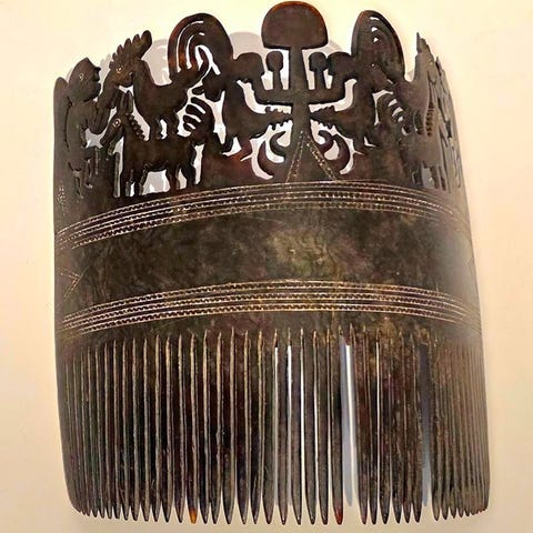 Indonesisk ceremonielt hårpynt i oksehorn, fint håndindgraveret, med perletråde ved enderne. Hovedmotivet er en repræsentation af en fugl, sandsynligvis en Bucero. Heraf kan man udlede, at det stammer fra det indonesiske Kalimantan. Fra første halvdel af det 20. århundrede. Købt i et antikvariat i Indonesien. Fuldt udstyret med udstillingsstøtte.
