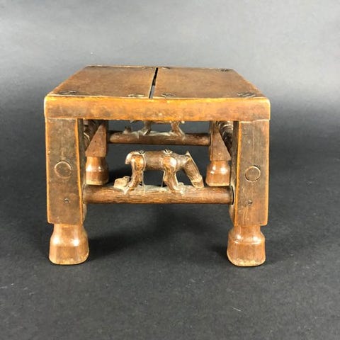 Træskulptur fra Congo i Chokwe-stilen, dateret mellem 1930 og 1940, mål 80 × 37 × 45 cm (sædehøjde 37 cm), vægt 3 kg, sælges uden underdel, i god stand med let åreforg og pletter, provenance: fransk samling. Klik på den blå "gå til varen" knap, for at købe eller byde på denne vare. Den samlede pris vil blive vist inden du afgiver dit bud.