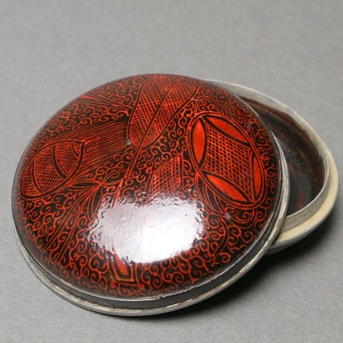 En keramisk kugleformet røgelsesmiddel af Murakami Genki I fra Shōwa-perioden med blågrønt shippo-mon-mønster, 12,5 cm høj og 12,1 cm bred, med en kuppelåben låg, tre gennemboringer og tre fødder, fremstillet i Japan og i fremragende stand, inklusive original tomobako-kasse. Klik på den blå "gå til varen" knap, for at købe eller byde på denne vare. Den samlede pris vil blive vist inden du afgiver dit bud.