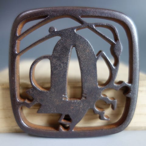 Dette er en jern Tsuba, hvor designet er en kran, eneboer på skildpadde.