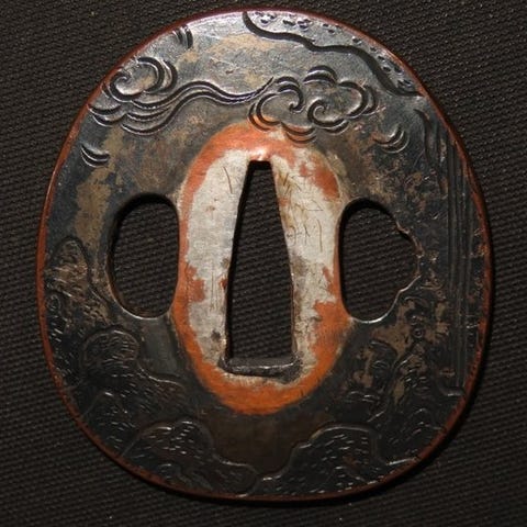 Et forfinet Edo-periode jern-tsuba med delikat kin-zōgan (guldindlæg) arbejde, der præsenterer en elegant scene med faldende regn, drivende skyer og efterårsgræs — motiver, der traditionelt symboliserer sindsro, forgængelighed og den poetiske ånd hos samuraien.