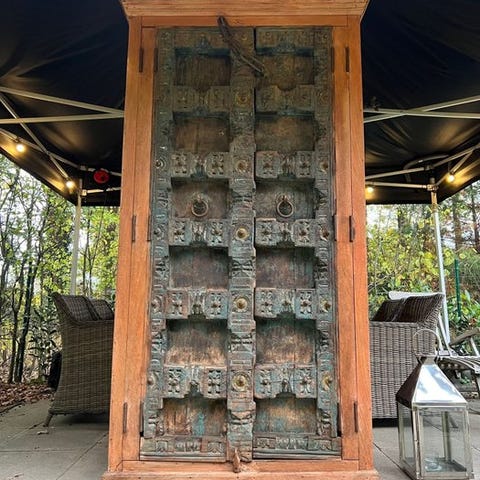 Gammel indisk Haveli-dør fra Gujarat/Rajasthan, ca. 1800–1850, i British India Company-stil, massiv teaktræ med grøn patina, mål 220 cm høj og 152 cm bred (åbning 186 x 98 cm), vægt ca. 150 kg. Klik på den blå "gå til varen" knap, for at købe eller byde på denne vare. Den samlede pris vil blive vist inden du afgiver dit bud.