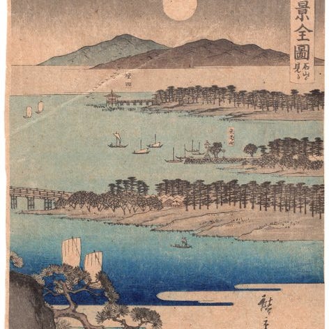 Meiji-æra træsnit af Utagawa Hiroshige, 1891, titel Thirty-six Views of Mount Fuji – The Oi River Between Suruga and Totomi Provinces, plade signeret, 26 × 37 cm, i god stand. Klik på den blå "gå til varen" knap, for at købe eller byde på denne vare. Den samlede pris vil blive vist inden du afgiver dit bud.