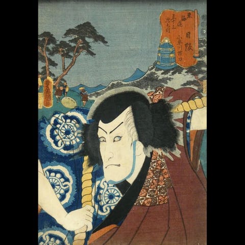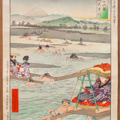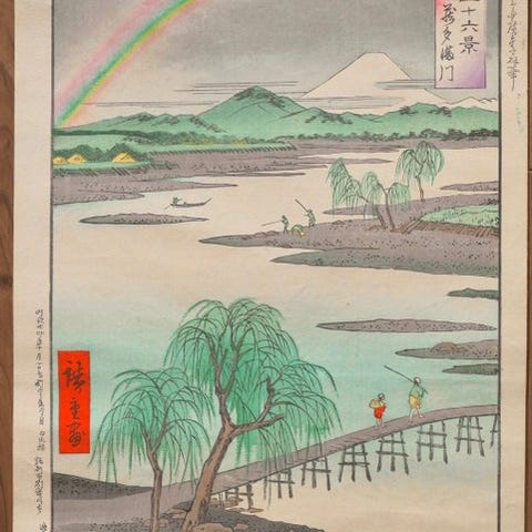 Original træsnit af Utagawa Hiroshige III (Meiji-perioden, 1890) med titel The Complete Eight Views of Ômi as Seen from Ishiyama, højre panel i et triptyk, Japan, 36 × 24 cm, underskrevet på pladen, i god stand med to knækker øverst, falmet og lille hul i øverste venstre hjørne, papirrester på de øverste hjørner. Klik på den blå "gå til varen" knap, for at købe eller byde på denne vare. Den samlede pris vil blive vist inden du afgiver dit bud.