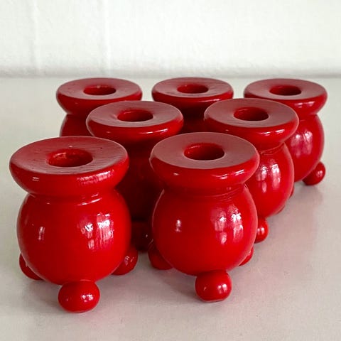 3 stk traditionelle svenske julelysestager af rødmalet træ. Af nyere dato. Til kronelys (der skal bruges lysmanchet for at lyset sidder ordentligt fast. Højde hhv ca 6,4 og 5,3 cm. De er ubrugte. De to med guldindsats har en lille bøjning af kanten, hvor de er limet fast. De er fremstillet sådan. Se billede. Sælges samlet til kr 120,-