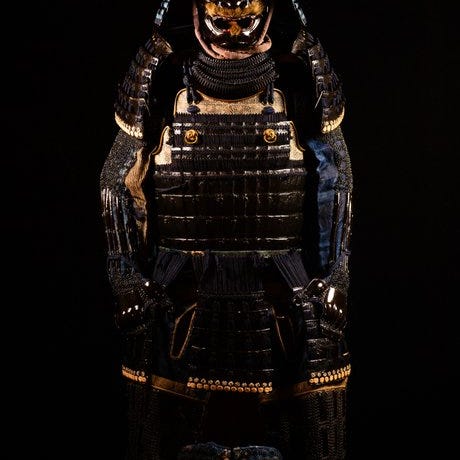 Yedo-periodens samurai‑yoroi rustning, komplet med kabuto, menpo, dō, sode, kote, haidate og suneate, bjørnefell kegutsu, original rustningsboks, fra Japan, i god stand, dimensioner 60 cm × 160 cm. Klik på den blå "gå til varen" knap, for at købe eller byde på denne vare. Den samlede pris vil blive vist inden du afgiver dit bud.