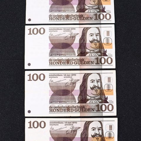 Samling af 8 hollandske sedler med varierende datoer, herunder 1 Gulden 1945, 2,5 Gulden 1949, 1 Gulden 1943, 10 Gulden 1940 II, 10 Gulden 1943 I, 10 Gulden 1945 II, 25 Gulden 1955 og 100 Gulden 1930; registreret forsendelse. Klik på den blå "gå til varen" knap, for at købe eller byde på denne vare. Den samlede pris vil blive vist inden du afgiver dit bud.