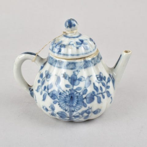 Kugleformet, pæreformet tepotte på fodring, med ribbet mave, buet håndtag og lige tud. Ribbet låg og knop. Imari, dekoreret i underglasurblå, jernrød og guld med blomster og florale motiver. På håndtaget en blomsterknop mellem krøller og på tuden stiliserede krøller.